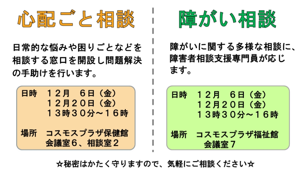 筑前町社会福祉協議会では、毎月第1、第3金曜日の13時30分から16時まで、心配ごと相談および障がい相談を開催しています。どのような相談でもお受けし解決に向けてのお手伝いを行います。